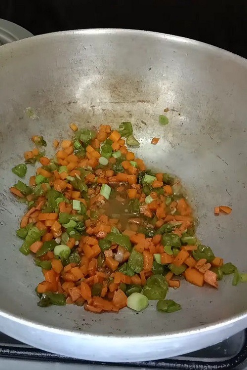 سخني مقلاة أو مقلاة كبيرة على نار متوسطة إلى عالية وأضيفي القليل من الزيت. يُسكب البيض المخفوق في المقلاة ويُخفق حتى ينضج تمامًا. أخرجي البيض من المقلاة واتركيه جانباً. في نفس المقلاة، أضيفي المزيد من الزيت إذا لزم الأمر وأضيفي الخضار المقطعة. قم بتحريكها حتى تصبح طرية ولكن مقرمشة.