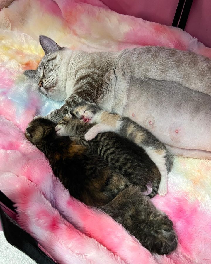After two weeks in temporary care, Willow went into labour. The guardian had to worry – the process was problematic and she had to take the cat to the vet… But luckily everything went perfectly. The kittens were born by caesarean section and all turned out healthy and adorable.