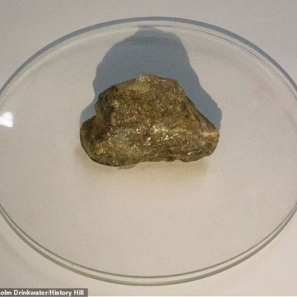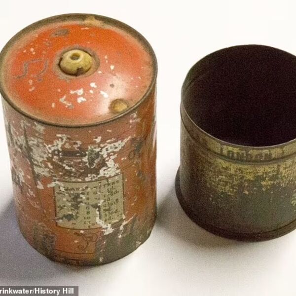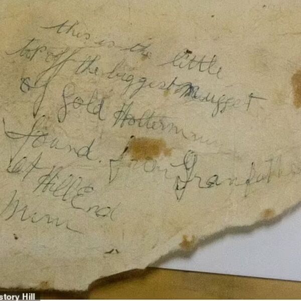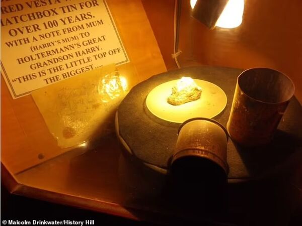 More than a century after the world’s largest gold specimen was dug from the earth, Holtermann’s great grandson produced the chip that had been knocked off the top, which he had kept in a tin under his bed. The tin is pictured