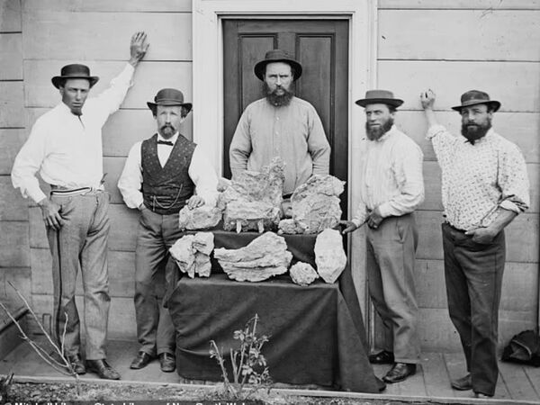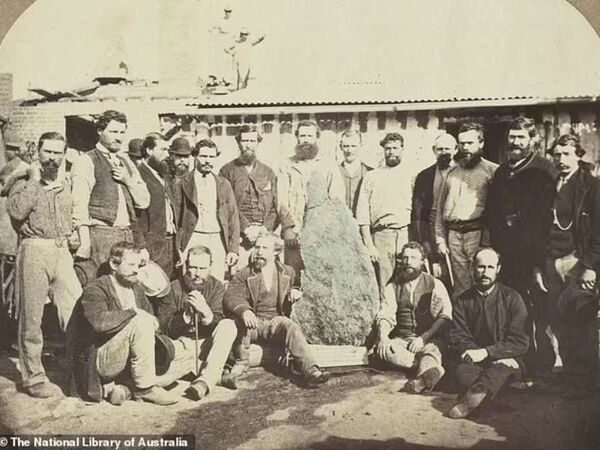 A few months after Holtermann’s nugget was found an even larger specimen, estimated to contain 155kg of gold was recorded in the Star of Hope’s day book. The miners reportedly broke it up underground. Holtermann, second from left, is pictured with the pieces