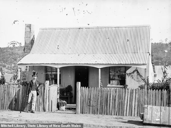 ‘Holtermann’s Nugget’ was not really a nugget at all. It was a mass of gold, quartz and slate broken from a quartz reef, correctly called a specimen or matrix. Holtermann is pictured outside his home in Tambaroora Street, Hill End