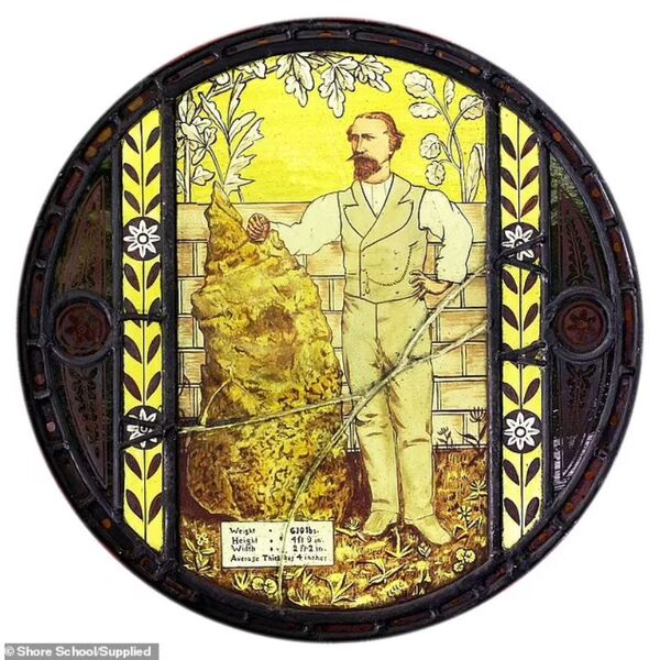 Holtermann had a 45cm diameter stained glass window featuring a representation of him with the nugget installed in his Sydney home, which is now part of Church of England Grammar School. The window is pictured