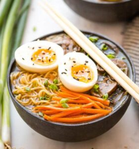 Now comes the most exciting part – assembling your homemade ramen bowl. Cook the ramen noodles separately according to the package instructions, then divide them between bowls. Pour the steaming broth over the noodles, watching as the rich liquid envelops them in a fragrant embrace. Top your creation with sliced scallions, sesame seeds, and a handful of shredded carrots, adding a burst of color and texture. Finally, the pièce de résistance – a perfectly soft-boiled egg, its velvety yolk adding a luxurious creaminess to every bite.