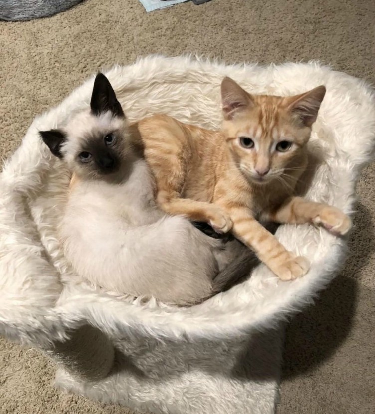 Since then, the friendly couple has become a real gang: they play, cuddle and sleep together. Chester is protective of Beatty. Often when she hears a sudden loud noise or is startled by something, she immediately runs to him. When Chester is picked up by the owner or he is not around, Beatty cries and looks for her protector.