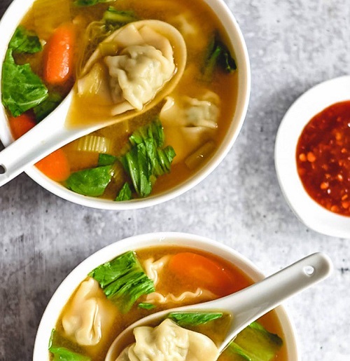 Creating the soul of Wonton Soup lies in the delicate wonton parcels. Start by combining coarsely chopped boneless pork loin and finely chopped shrimp in a bowl. Add a dash of Chinese rice wine, light soy sauce, brown sugar, green onions, and fresh ginger root. This aromatic blend forms the heart of your wontons. Gently encase this flavorful filling in thin, square wonton wrappers. Each fold and pinch carry the promise of a delightful burst of flavor in every bite.
