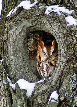 An Eastern Screech-Owl roosting in a tree cavity. Photo by avicentric via Birdshare. 5. Roost In A Cavity